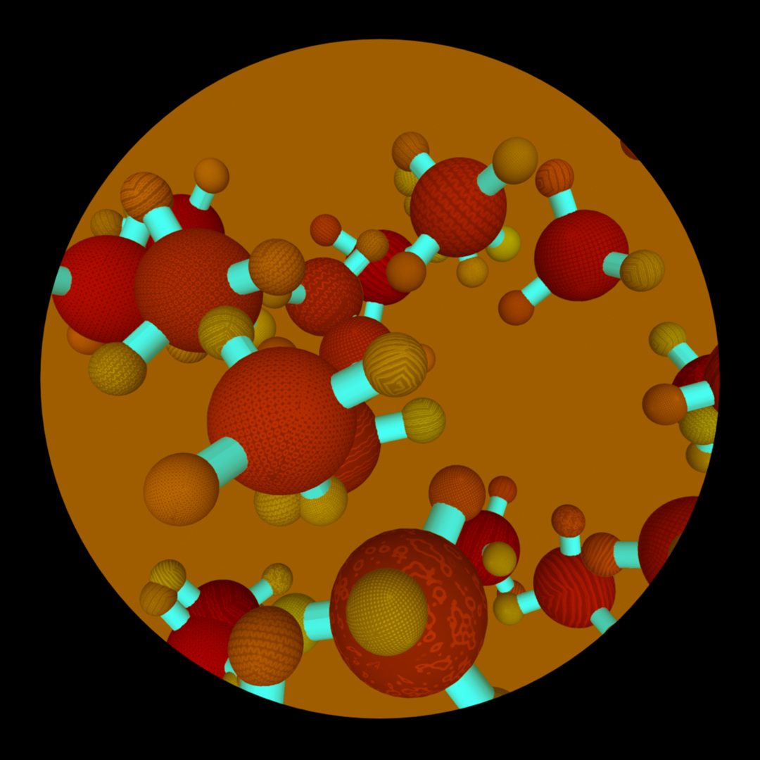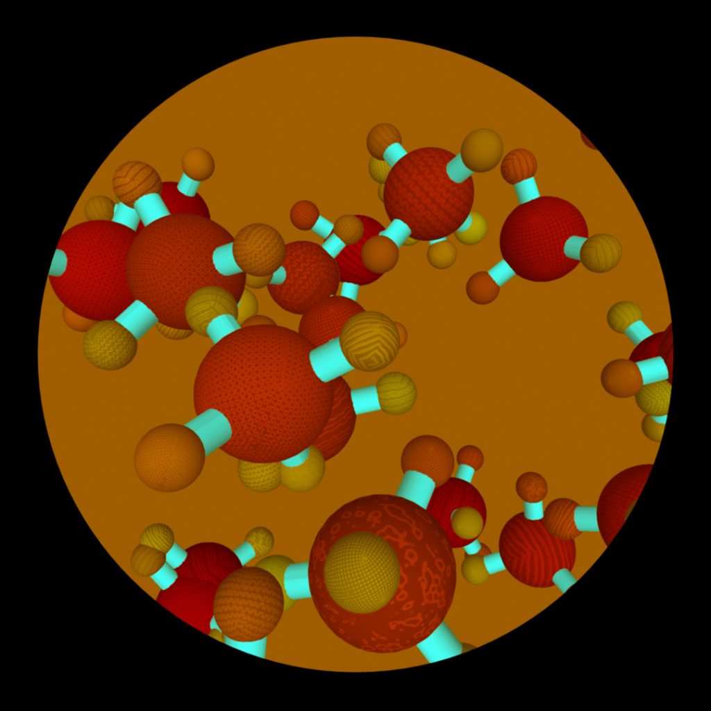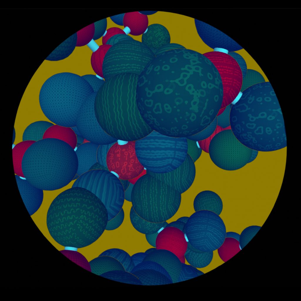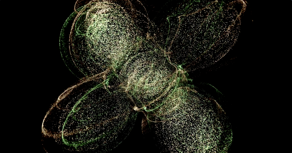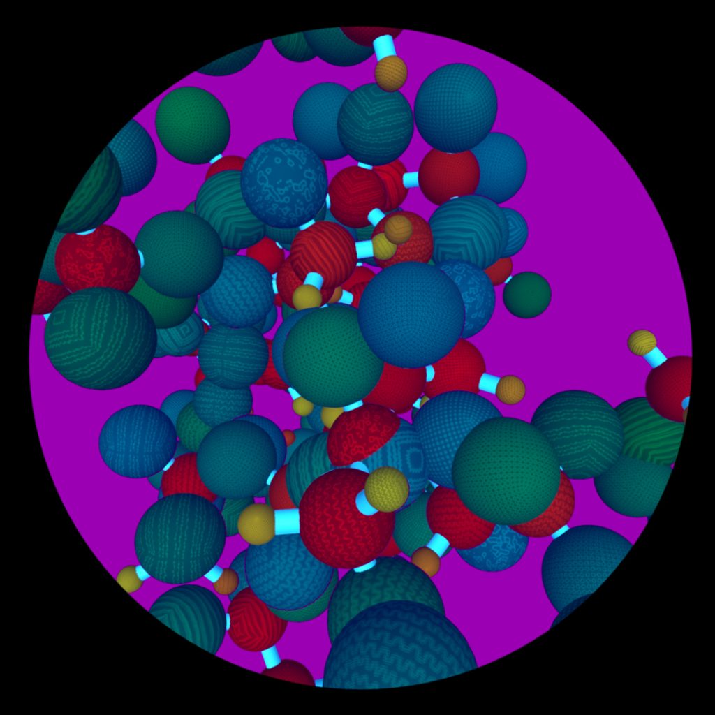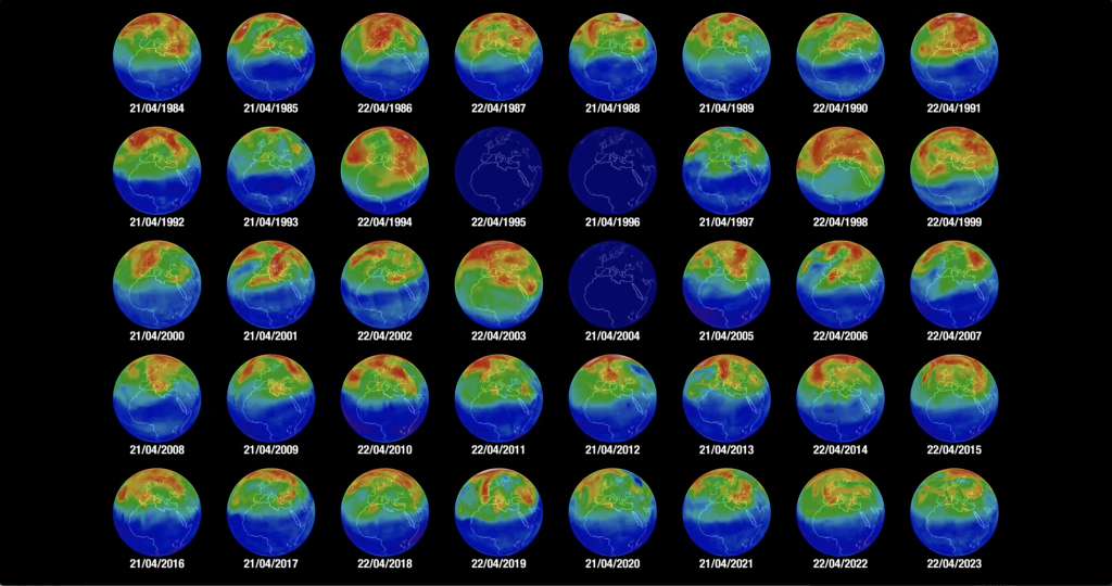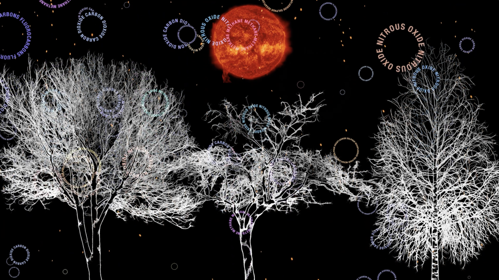In the work, we see the ozone layer above the earth changing over time, and the carbon atom as a spinning cloud of electrons. The science of climate change is represented through beautiful and dynamic visuals.